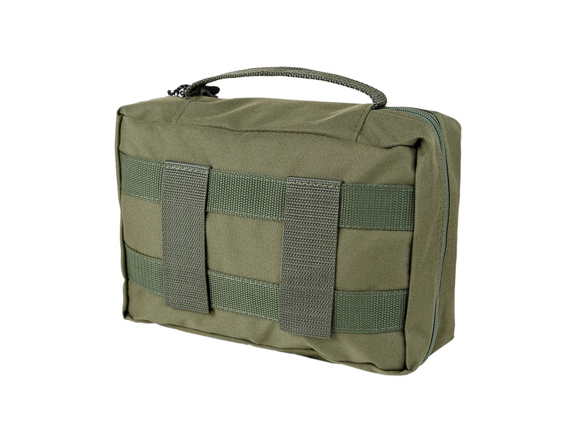 Аптечка изготовлена из ткани полиэстер, имеет два отделения, закрывающиеся застежкой молнией. Первое отделение укомплектовано карманом сеткой и еще одним откидным карманом на молнии. Второе отделение укомплектовано двумя откидными карманами из сетки. На задней стенке предусмотрено крепление на ремень при помощи шлёвок. Размер 28х18х6 см.